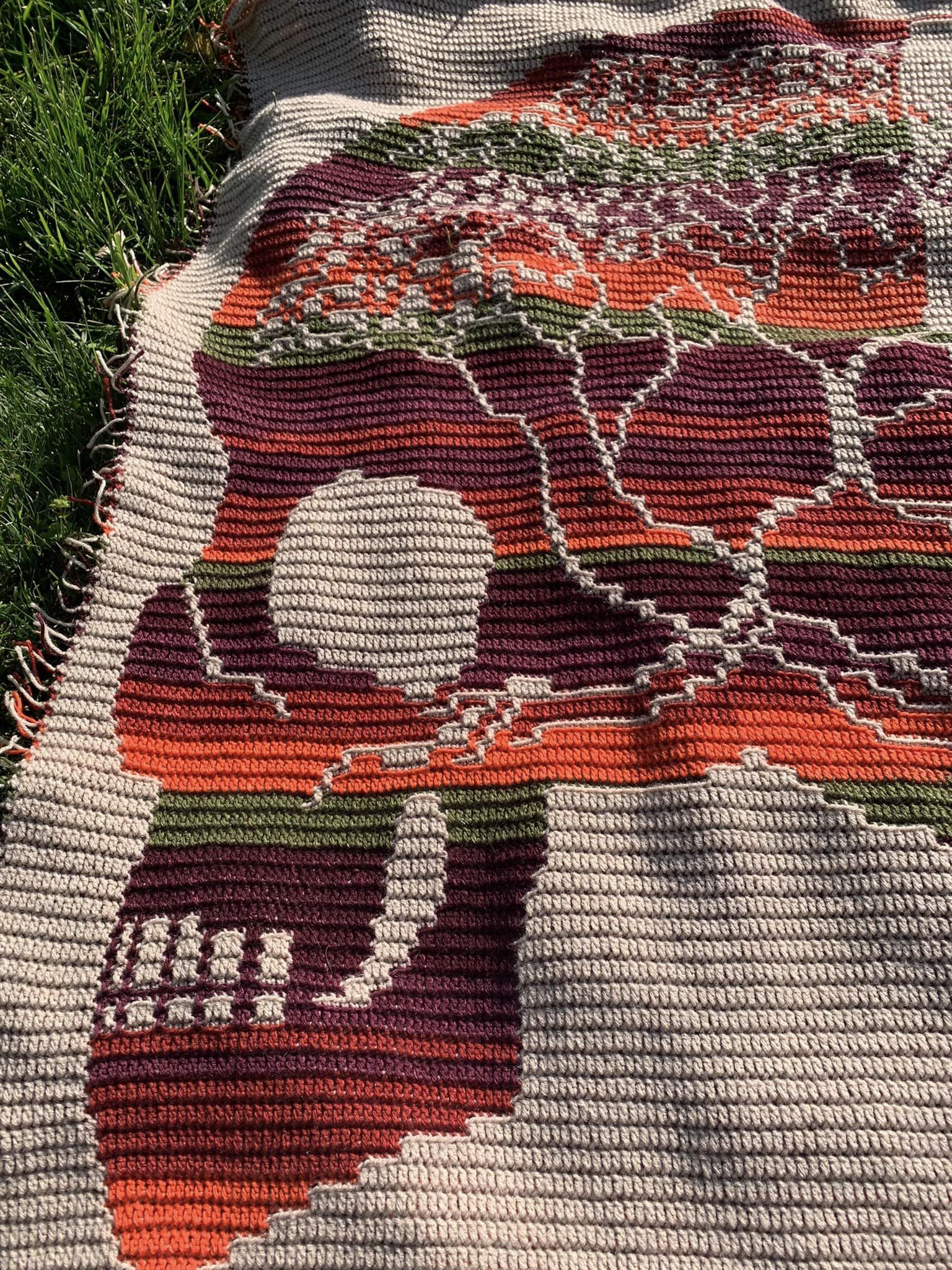 The blanket patterns are worked with the front of your work facing you at all times. Each row is started on the right and worked to the left, then finished off at the end. As an overlay mosaic pattern is worked, your blanket may roll and curl – this is normal! Just keep going and it will flatten out as it gets bigger. A border will also help it keep its shape.